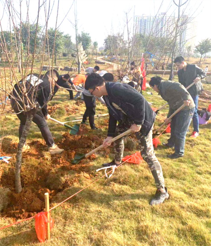 在活動負責人進行任務布置、流程講解后,城投集團團委的青年們便開始了有序的植樹活動。大家分工明確、齊心協力,揮舞鐵鍬翻新土,扶植新苗列成行,呈現出一派熱火朝天的勞動場面。