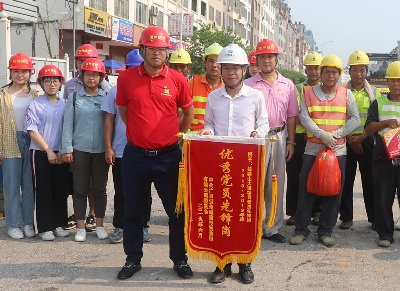 在項目現場,蘭乾雄為戰斗在一線的工人們發放了西瓜、清涼飲料,并與工人代表拉起了家常,一一詢問了工人的家庭、收入及工資發放等情況。他說到,正是因為有一線工人們的努力和堅守,我們的一些重點工程和項目才能順利向前推進,他們是最值得尊敬的人。同時,蘭乾雄為姑婆山大道項目頒授了“2018-2019年度優秀黨員先鋒崗”旗幟,肯定了他們為項目建設的付出,鼓勵他們繼續充分發揮黨員先鋒崗先鋒模范作用。