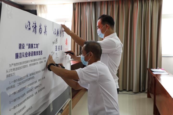 活動重溫了入黨誓詞,聘請各項目監(jiān)理單位人員為“廉政監(jiān)督員”,并在清廉工地承諾墻上開展集體簽名活動,立下高質(zhì)量建設“清廉工地”的錚錚誓言。“廉政監(jiān)督員”們圍繞自身工作實際,談履職,話清廉,對“清廉工地”建設建言獻策,扎實推進黨建領廉、文化助廉等廉政建設。