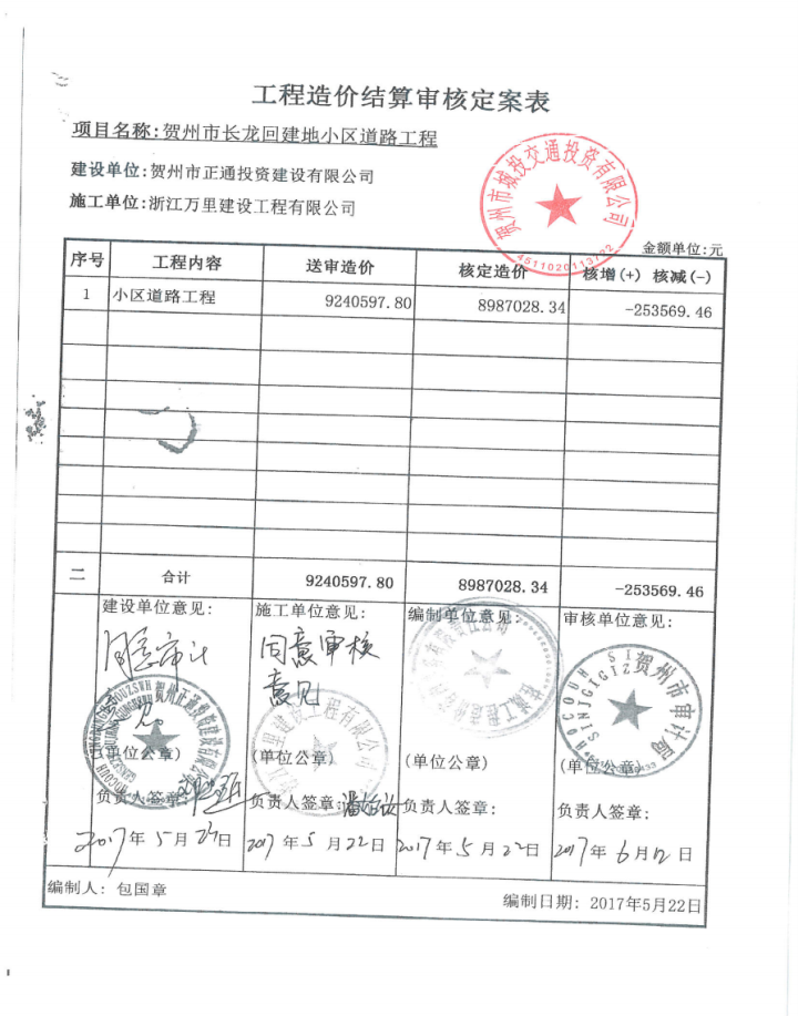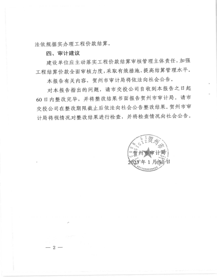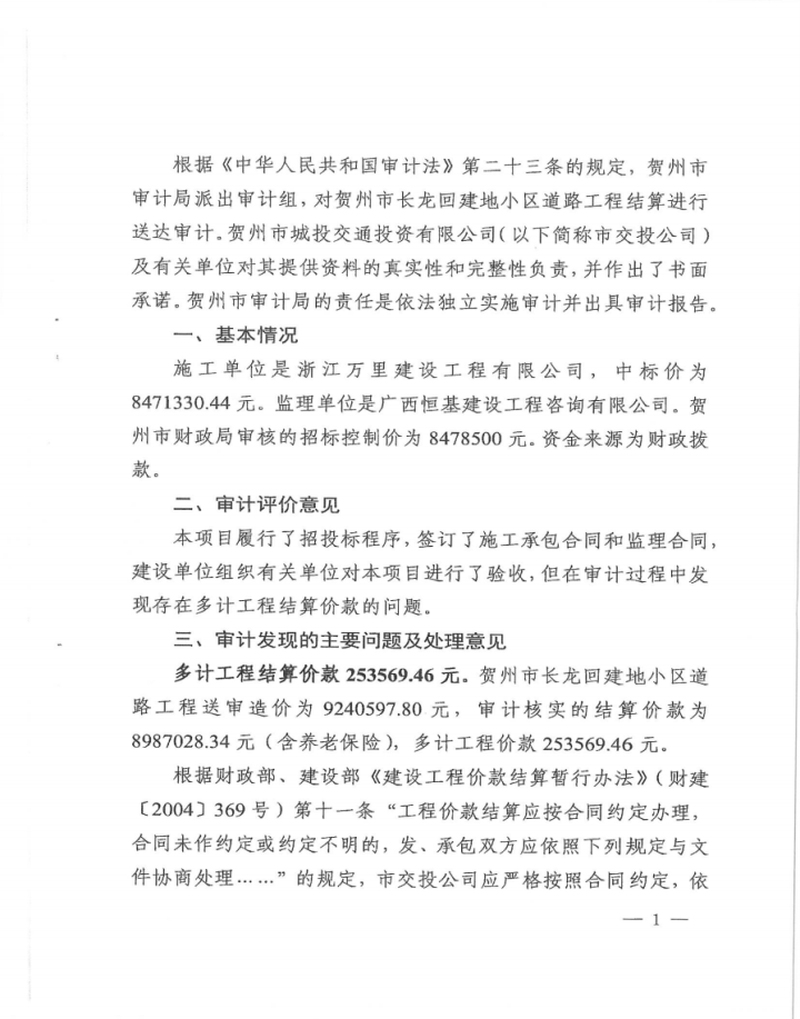 城投集團關于賀州市長龍回建地小區道路工程結算審計整改情況報告公示